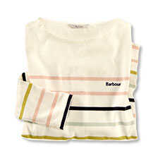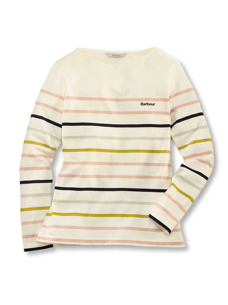 Erobert unser Herz im Sturm: dieses neue Barbour-Shirt mit modischen Multicolor-Streifen in Rosa, Limone, Mint und Navy. Locker, sportiv und unkompliziert passt es zu fast allem im Schrank. Einen entspannten Touch erhält das Shirt durch den schmeichelnden Ausschnitt, die langen Ärmel, den geraden Saumabschluss mit kleinen Schlitzen und die dezente Barbour-Stickerei. Softer Jersey-Feinstrick verspricht angenehmen Tragekomfort. Leicht taillierte Passform (Regular Fit). Länge ca. 65 cm. Original Barbour.