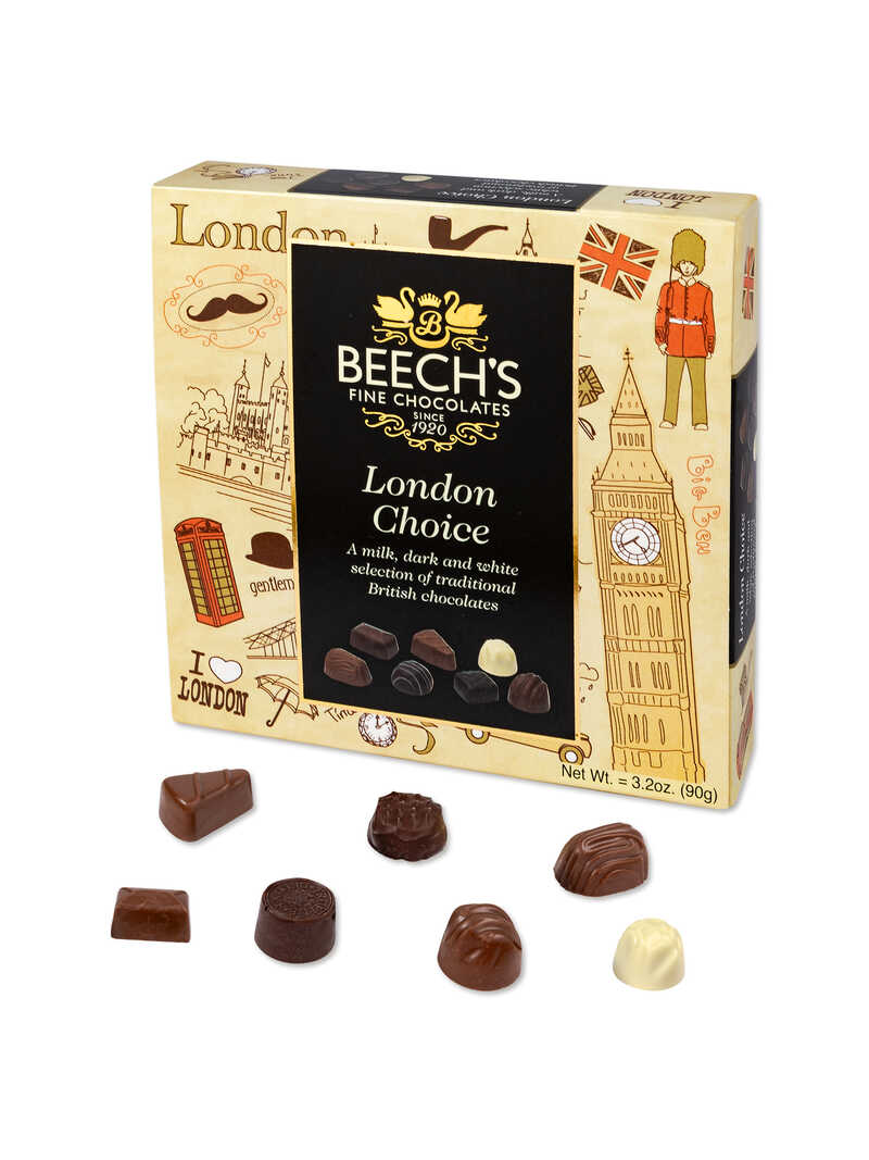 Eine kleine Auswahl traditioneller britische Pralinen mit Orange Truffle, Hazelnut Swirl, Caramel Delight, Dark Marzipan, Strawberry Parfait, Hazelnut Supreme und Luxury Vanilla Mousse. 7 Stück (90 g) in Themenbox mit den typisch Londoner Motiven. Original Beech's Fine Chocolates
