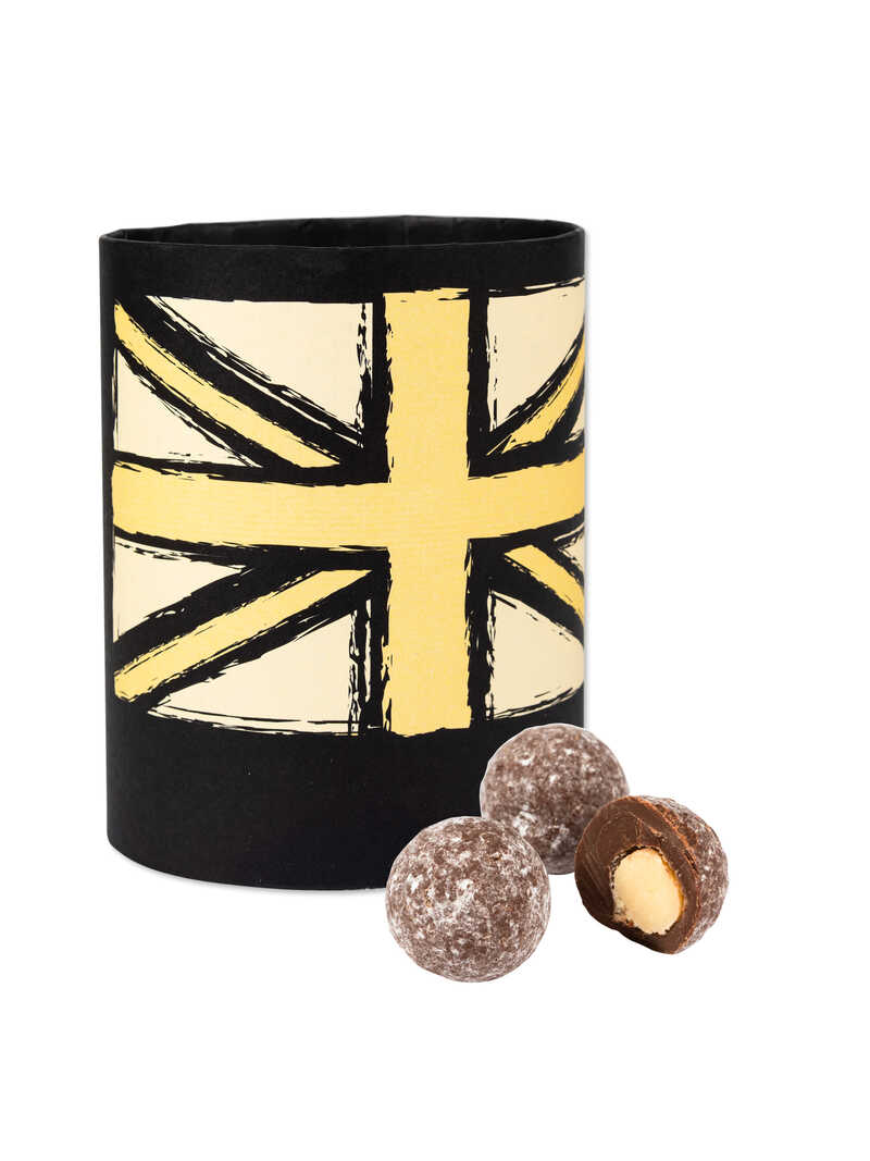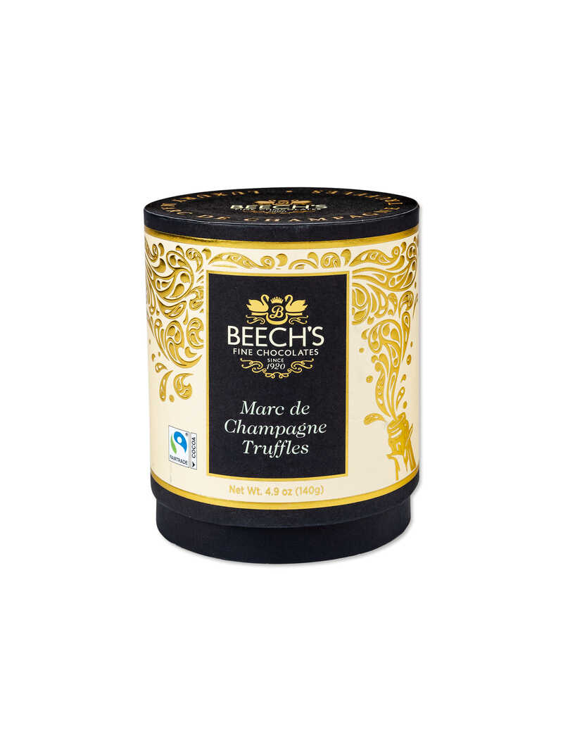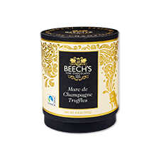 Ein zarter Kern aus weißer Schokolade, der großzügig mit Marc de Champagne aromatisiert ist, umhüllt von Milchschokolade und leicht mit Puderzucker bestäubt. Ein echter Genuss! 12 Stück (140 g) in nostalgisch anmutender Rundschachtel, die einer Hut-Box ähnelt. Original Beech's Fine Chocolates.