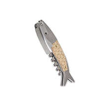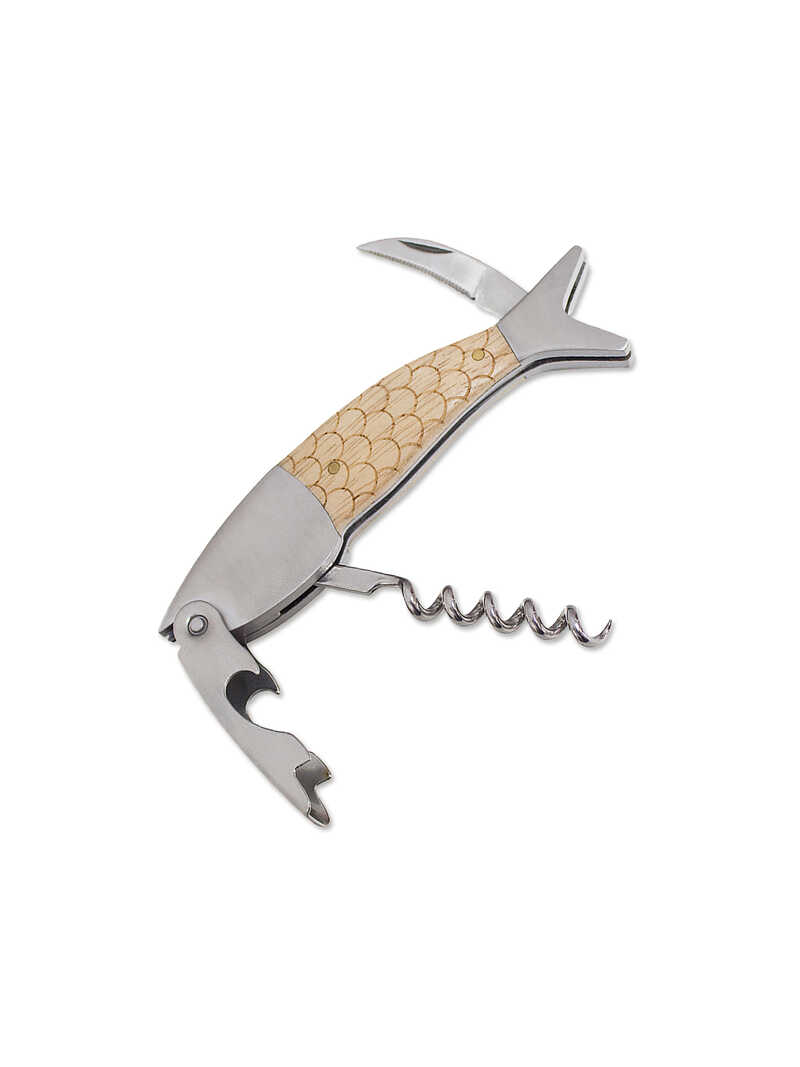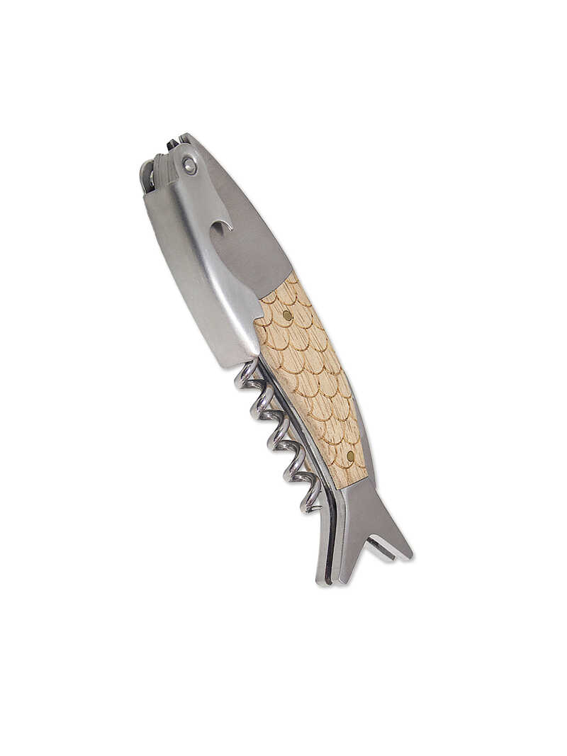 Dieser Flaschenöffner in Form eines Fisches ist ausgestattet mit einem edlen Holzgriff und verziert im Schuppendesign. Er ist Folienschneider, Korkenzieher und Flaschenöffner in einem und damit ein sehr praktisches Werkzeug! Sehr schön anzuschauen ist die nostalgisch anmutende Metallbox im Retro-Design (Größe etwa 18 x 7 x 2,5 cm), in der der Flaschenöffner geliefert wird und die zur sicheren Aufbewahrung dient. Der Flaschenöffner selbst hat (zusammengeklappt) eine Größe von etwa 13 x 4 cm. Von Balvi.