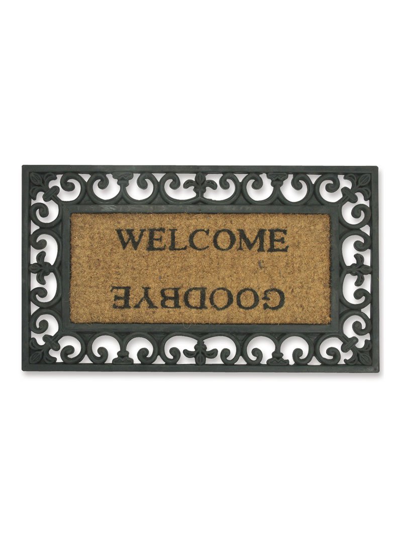 'Willkommen' und 'Auf Wiedersehen' grüßt diese Fußmatte - entsprechend der Richtung, aus der sie überschritten wird. Praktischen Nutzen hat sie zudem: Das Mittelfeld besteht aus robusten Kokosfasern, die beim Abstreifen der Schuhe wie eine Bürste wirken. Die Umrandung wirkt auf den ersten Blick wie kunstvoll gestaltetes Gusseisen, besteht aber - unter uns gesagt aus praktischem, pflegeleichtem Gummimaterial. Größe 76 x 44 cm.