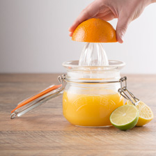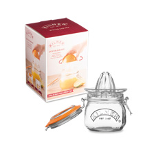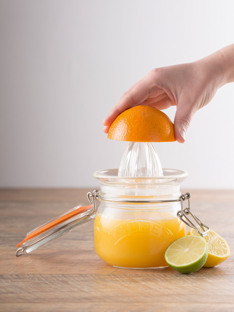Diese Saftpresse aus dem Hause Kilner möchten Sie nicht mehr missen! Perfekt zum Auspressen von Zitronen oder Apfelsinen für einen frischen Orangensaft am Morgen. Der Clou ist die Kombination mit dem nostalgischen Einmachglas (500 ml Fassungsvermögen), in dem Sie den Saft der Früchte aufbewahren oder noch nichtverarbeitete Zitronen lagern können. Der klassische Clip-Deckel mit Silikonring hält Saft oder Früchte frisch. Größe: Durchmesser 15 cm, Höhe 21 cm. Hergestellt von Kilner, Liverpool/England.