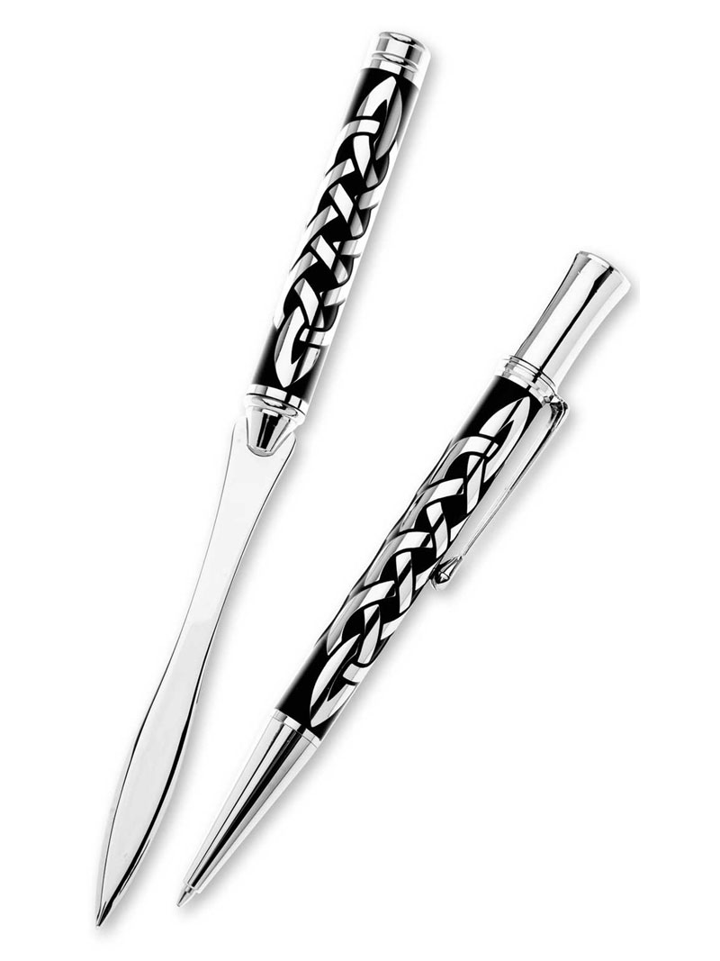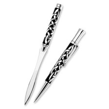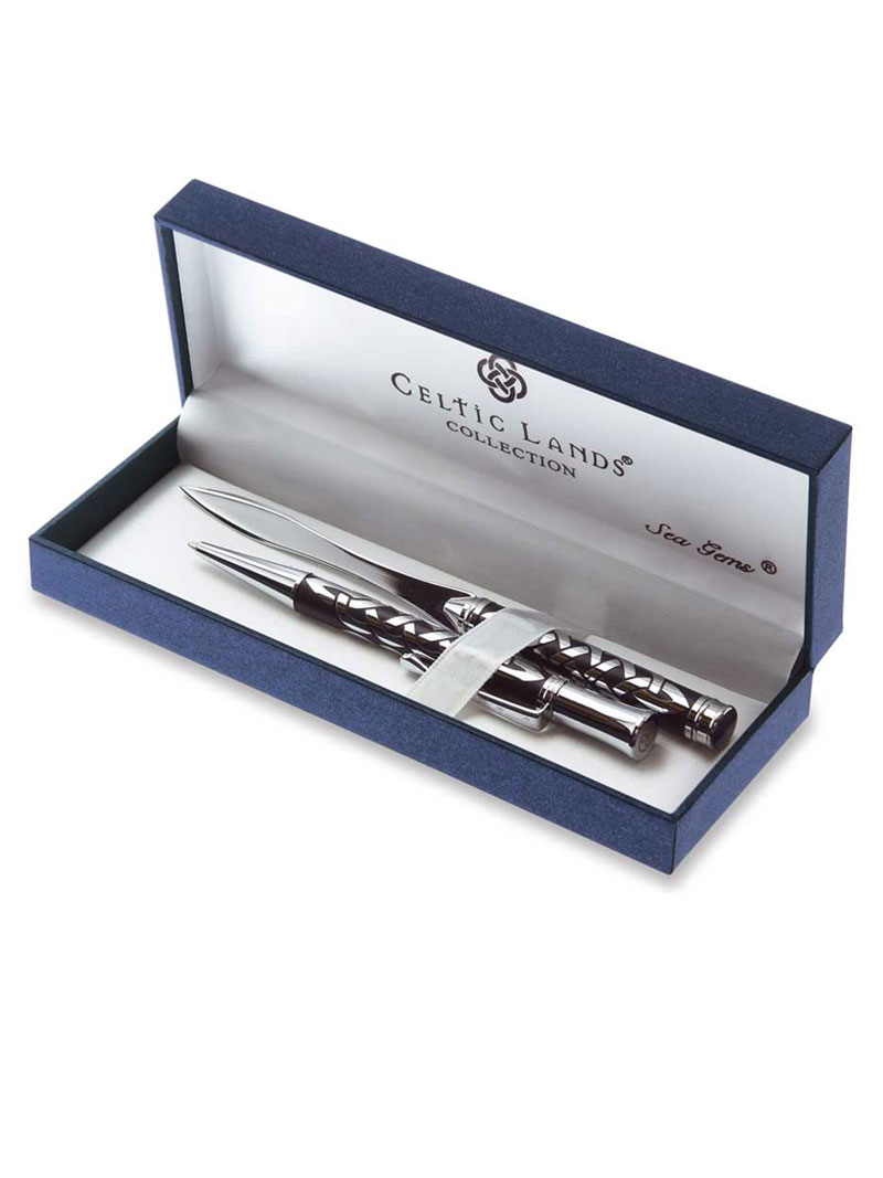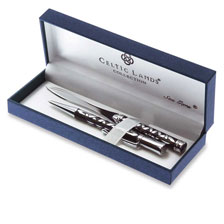 Dieses elegante Set besteht aus Kugelschreiber und Brieföffner und ist verziert mit dem traditionellen keltischen Motiv. Der keltische Knoten ohne Anfang und Ende symbolisiert den Kreislauf des Lebens und hat hohe mythologische Kraft und Ausstrahlung. Der Kugelschreiber hat eine Länge von 12,5 cm und liegt angenehm in der Hand. Mit dem 16 cm langen Brieföffner lassen sich Briefumschläge bequem öffnen. Lieferung in schöner Geschenkbox. Made by Sea Gems Ltd., Penzance, Cornwall, England.