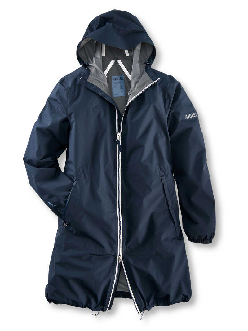 Eine Regenjacke sollte genau drei Dinge besitzen: Sie sollte wasserundurchlässig, gleichzeitig atmungsaktiv und am besten superleicht sein, um sie immer gerne dabei zu haben! Genau so ein Modell ist diese Regenjacke von Aigle im modisch längeren Parka-Schnitt. Der Clou ist eine Zipperinnentasche, in die sich die komplette Jacke im Nu verstauen und so auf ein Minimum verkleinern lässt - ideal zum Mitnehmen. Smarte Elemente verleihen der Jacke ihre sportive Note, wie die feste Kapuze, der Zweiwege-Reißverschluss auf weißem Band, zwei seitliche Zippertaschen und die weiß getapten, dadurch wasserdichten Innennähte. Praktische Gummizüge an Ärmeln und Saum halten Wind und Kälte draußen. Jetzt kann der Regen kommen! Logo am linken Oberarm. Lockere Passform (Regular Fit). Länge ca. 96 cm. Farbe: Navy. Original Aigle.