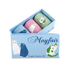 Dieses Sockentrio lässt das Herz eines jeden Katzenliebhabers höherschlagen! Die drei frühlingshaften Pastellfarben Lindgrün, Rosa und Himmelblau bilden eine fabelhafte Bühne für die eingestrickten Kätzchen. Und jede der drei Samtpfoten sieht anders aus. Das Highlight ist die schöne Geschenkbox, so kann man damit auch anderen eine Freude machen! Farbe: Rosa-Lindgrün-Bleu. Original Mayfair. (3er-Set)