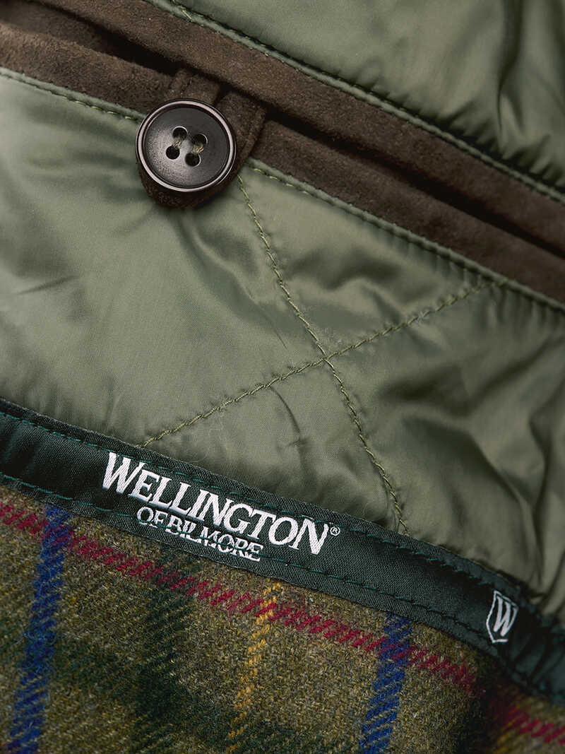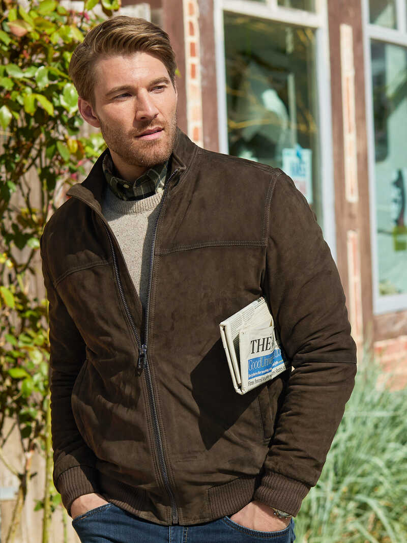 Der zeitlos-lässige Schnitt eines Blousons kombiniert mit geschmeidig-weichem Wildleder - wenn jemand Jacken kann, dann Wellington of Bilmore! In der Übergangszeit ist eine Lederjacke wie diese Gold wert, denn sie passt zu vielen Aktivitäten und sieht dabei kernig und cool aus. Die typischen Blouson-Details verleihen ihr eine sportive Note, wie der Stehkragen, der Metallreißverschluss sowie die farblich passenden Rippenstrickbündchen an Ärmeln und Saum. Eine ganze Reihe an Taschen sorgt für genügend Stauraum: zwei senkrechte Zipper-Paspeltaschen auf der Vorderseite sowie drei hochwertige Innentaschen. Ein weiteres Highlight ist das Futter, welches schön warmhält. Im oberen Bereich besteht es aus wattiertem Rautenstepp, unten besticht es mit klassischem Karofutter aus einer Wollmischung. Dieser Wildlederblouson ist ein zeitloser Klassiker, der mit den Jahren immer schöner wird! Normale Passform (Regular Fit). Länge ca. 68 cm. Farbe: olivbraun. Original Wellington of Bilmore.