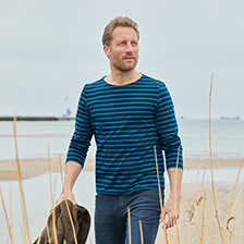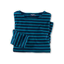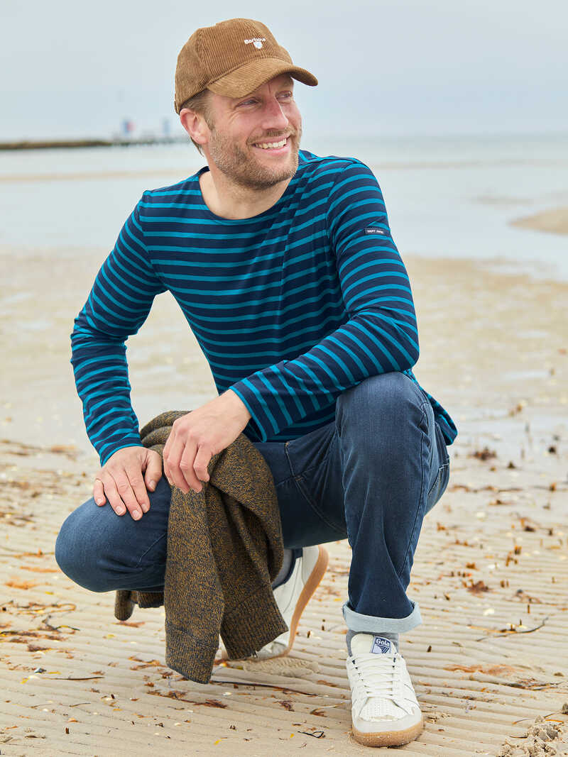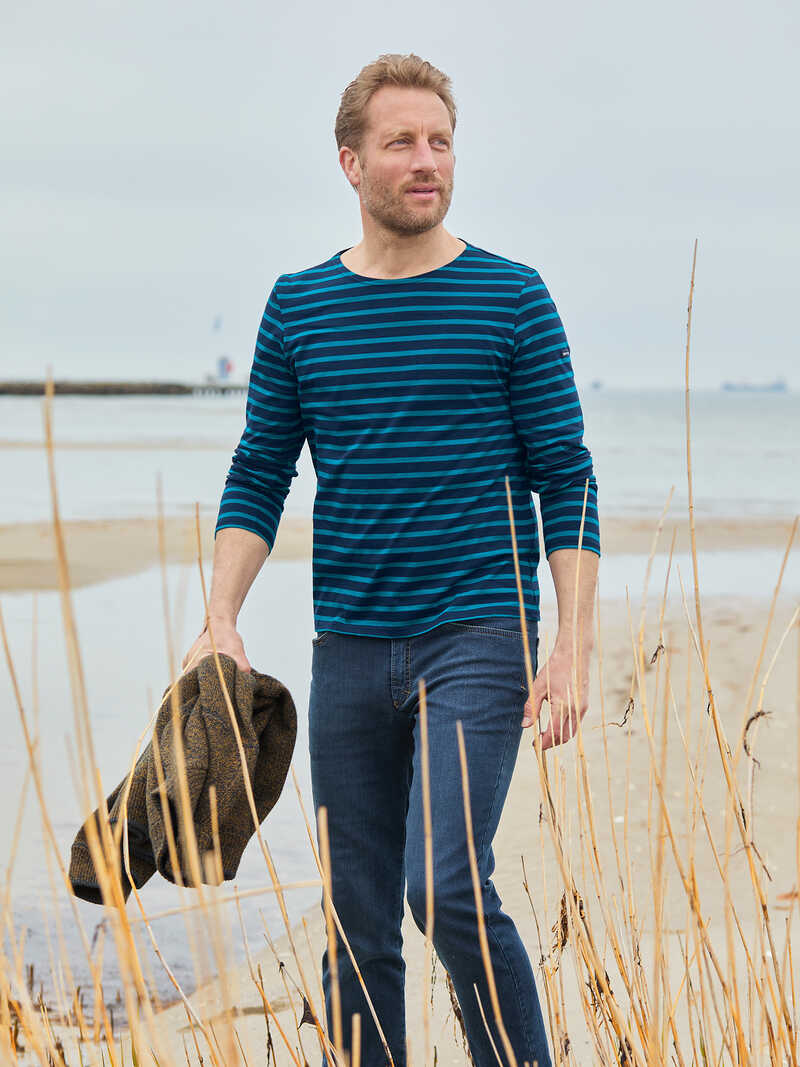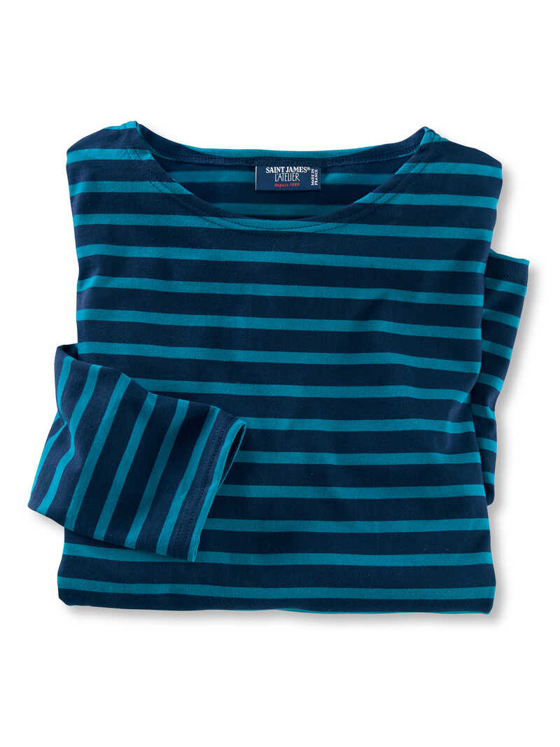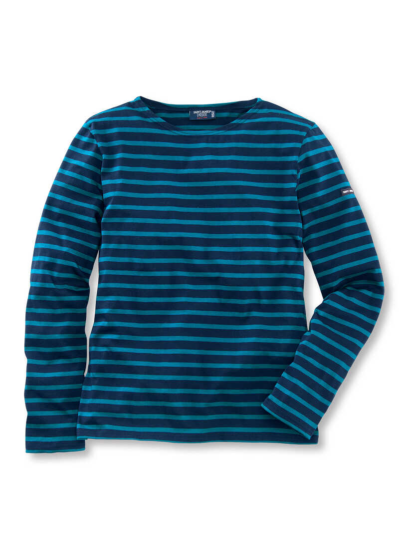 Das Streifenshirt des französischen Labels Saint James erfreut sich schon seit Jahrzehnten größter Beliebtheit. Dieses hier ist aus leichtem Baumwoll-Jersey gearbeitet und praktisch und stylish zu jeder Jahreszeit. Ein exklusives Shirt, das in Ihrem Kleiderschrank nicht fehlen sollte. Mit langen Ärmeln und geradem Saumabschluss. Normale, schlanke Passform (Modern Fit). Länge ca. 73 cm. Farbe: navy-türkis. Original Saint James.