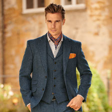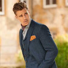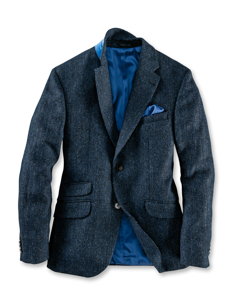 Dieses Harris Tweed-Sakko im blauen Fischgrat-Dessin mit Überkaro wird traditionell gefertigt und zeigt die klassischen Details: Zwei-Knopf-Form mit seitlichen Schlitzen, Kragenfilz, Brusttasche, Pattentaschen, Billett-Tasche und vier Innentaschen. Normale, schlanke Passform (Modern Fit). Länge ca. 76 cm. Original Wellington of Bilmore.