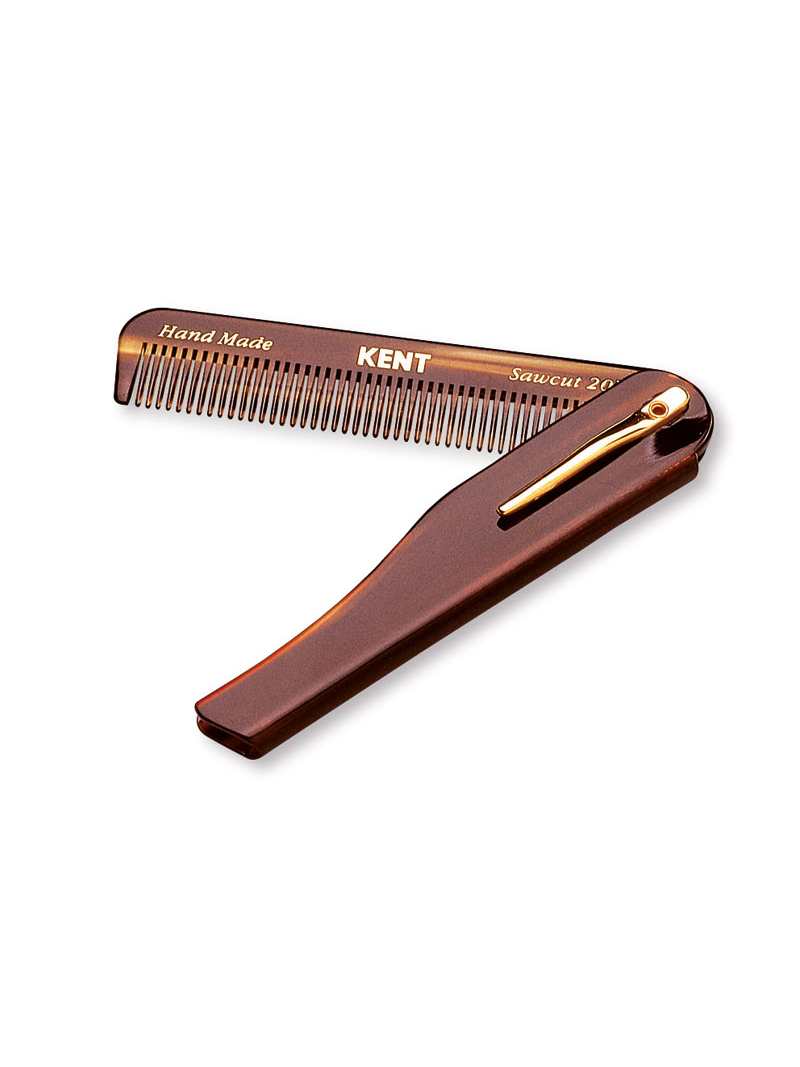 Dieser praktische, feingezahnte Taschenkamm macht sich zusammengeklappt auf 9,5 cm Länge ganz klein. Mit einem Messingclip kann er z.B. an der Brusttasche befestigt werden. Er besteht in Kamm und Hülle aus Zelluloid. Original vom Hoflieferanten G.B. Kent & Sons, Bürstenmacher seit 1777.