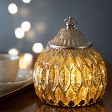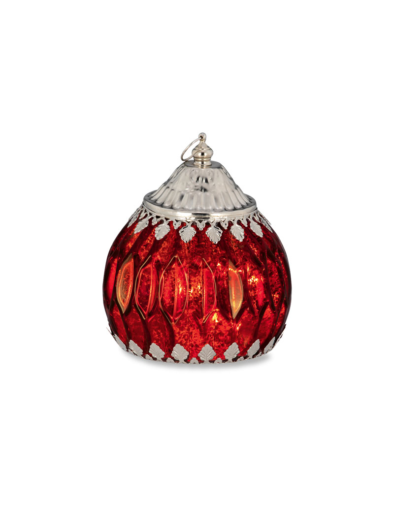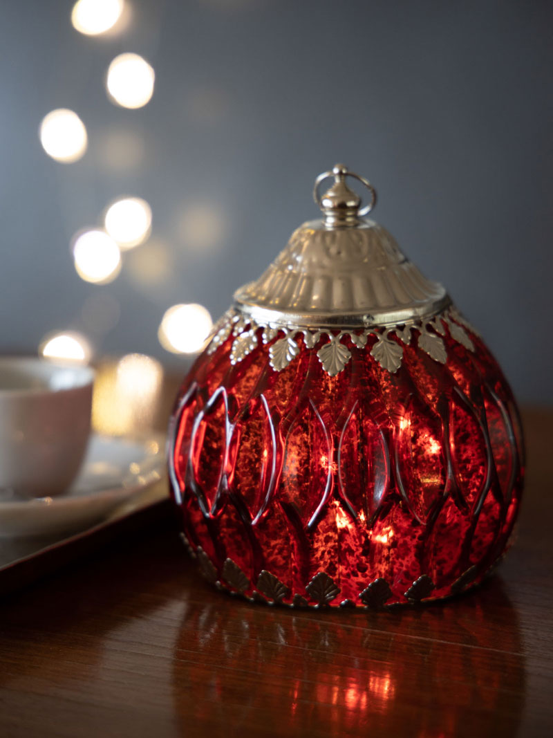 Für ein zauberhaftes Licht und eine gemütliche Stimmung in der dunklen Jahreszeit sorgen diese edlen Glaslaternen mit Ornamentdekoration. Im Inneren befindet sich eine 5er-LED-Lichterkette (warmes Licht), die das bunte Glas zum Strahlen bringt. Sowohl zum Aufhängen wie auch zum Hinstellen geeignet. Lieferung inkl. zwei AAA-Batterien. Größe Durchmesser 12,5 cm, Höhe 15 cm. Farbe: rote Glaslaterne.