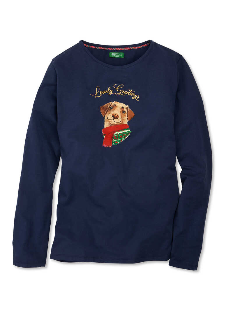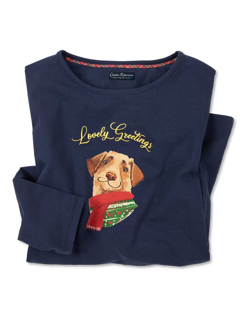 Echte Winter- und Weihnachtsfans kommen mit diesem Shirt ganz groß raus. Der originelle Print zeigt einen lächelnden Labrador - eingekuschelt in Schal und Winterpullover - und darüber goldfarben aufgestickt Lovely Greetings. Hochwertiger Jersey sorgt für ein besonders weiches Tragegefühl und zeichnet sich durch seine komfortablen und formbeständigen Eigenschaften aus. Mit schmeichelndem Rundhalsausschnitt (innen mit rot karierter Paspel abgesetzt), langen Ärmeln und geradem Saumabschluss. Leicht taillierte Passform (Regular Fit). Länge ca. 62 cm. Farbe: Navy. Original Charles Robertson.