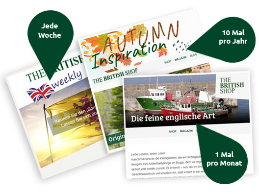 Erhalten sie 1 Mal pro Monat unseren Newsletter "Die feine englische Art". Wir informieren Sie darin über Neuigkeiten aus Kultur und Lebensart auf den britischen Inseln, außerdem finden Sie Reisetipps, Rezeptvorschläge und das aktuelle TV-Programm mit allen Sendungen rund um Großbritannien und England - absolut werbefrei für alle Freunde der Britischen Lebensart.